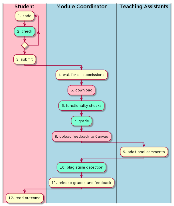 The combined workflow for programming assignments is in the figure. Actions in green are fully automated and fast. Actions in red can be automated but require some technical know-how for module-specific adaptations. Most time is spend at stages 4 and 9 due to individual deadline extensions and manual inspections.
