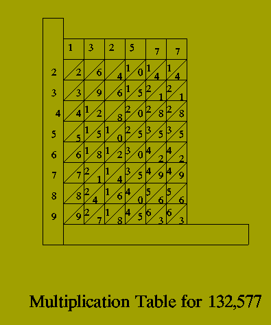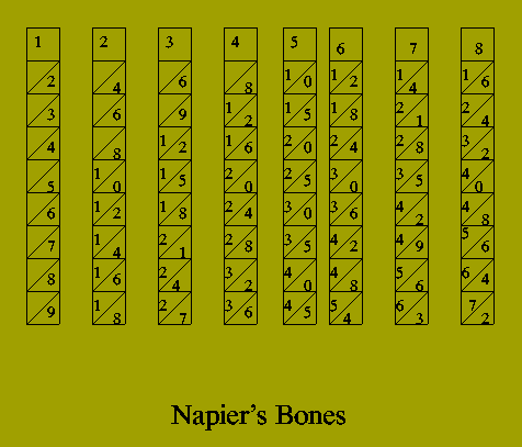 Towards the end of his life, Napier invented a device which, for many years, was more highly regarded than his researches concerning logarithms: a mechanism for simplifying the task of multiplying numbers that has since become known as Napier's bones^9. Napier's bones were, in effect, a clever representation of multiplication tables: