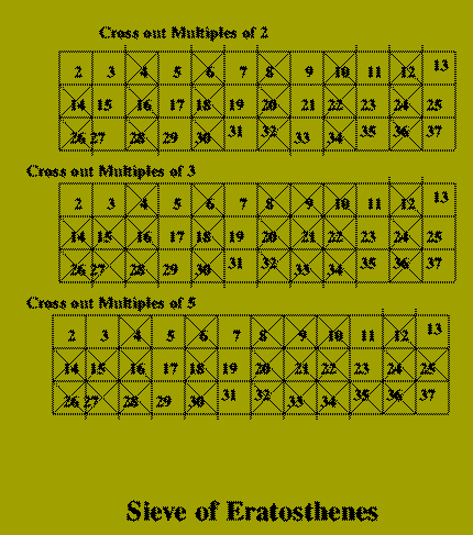 Euclid's Algorithm Euclid's work was not the only early investigation of algorithms. Another important Greek contribution concerns a problem which is still very much of interest today em the generation of prime numbers. The first algorithm to identify prime numbers is the famous Sieve of Eratosthenes (fl. 3rd Century B.C). Write down all the numbers from 2 to n and then carry out the following steps:
